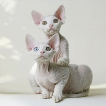 The Devon Rex cat has an elfin face and big ears. Its coat can vary from thin fur, suede type to loose curls. It is a good choice for allergic cat lovers.