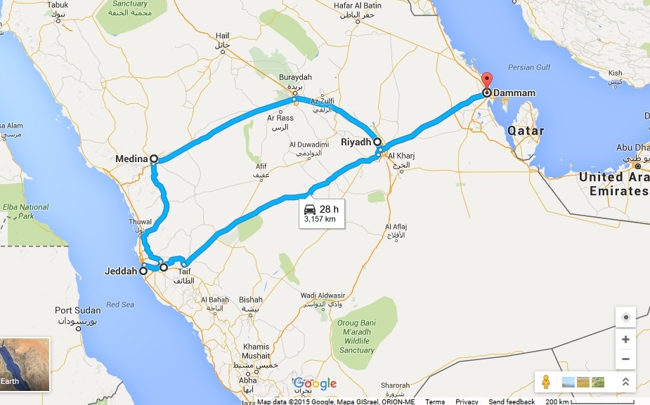 Az and I went to Saudi Arabia for two weeks. A road-trip was planned in the first week of our stay. We were to visit Medina and Mecca. The route planned was Dammam–Riyadh (1 night stay)–Medina (2 nights stay)–Mecca–Jeddah (2 nights stay)–Dammam. As much I enjoyed the entire trip, it was the drive across the country that I enjoyed the most.