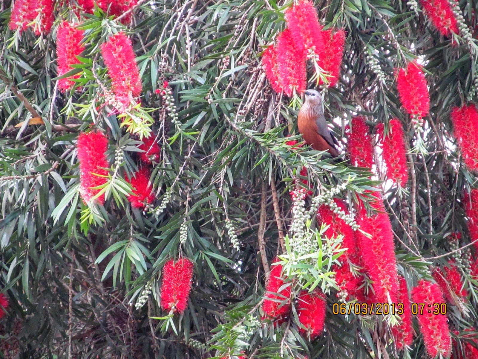 | Weeping Bottlebrush back home. Check out the pretty bird perched on it. |